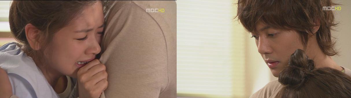 Ha Ni langsung berbalik dan memeluk Seung Jo, "Aku sangat takut. Aku takut jika sesuatu yang berbahaya terjadi pada Eun Jo." Seung Jo menenangkan Ha Ni, "Sudahlah tidak apa-apa." Ha Ni terus menangis dan dalam hati dia berkata, "Ini pertama kalinya... Seung Jo berkata dengan lembut padaku. Hitiku benar-benar merasa lega. Mata dan hatiku... Aku menangis terus menerus. "